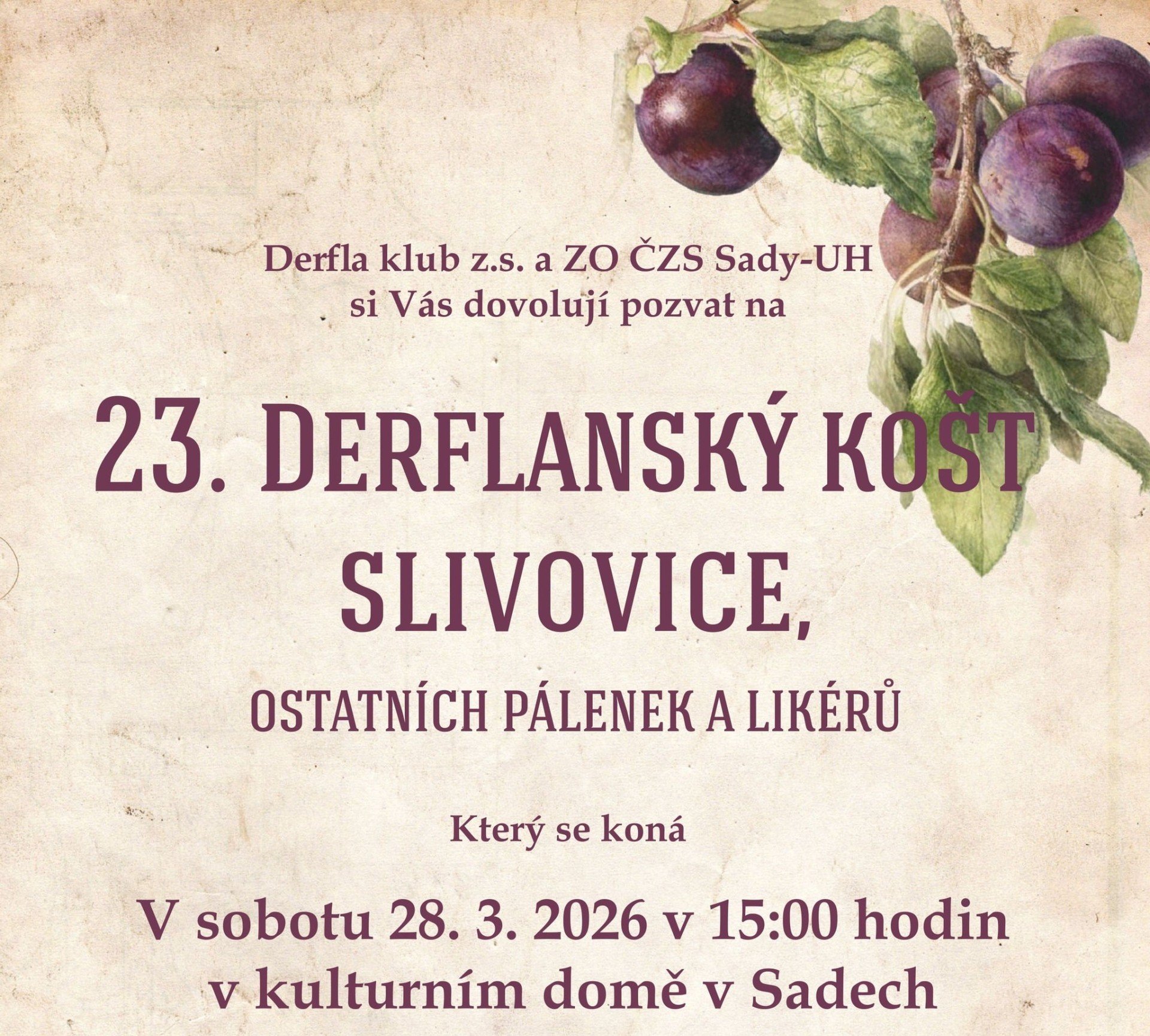 Kdo má rád dobrú slivovicu, meruňkovicu, jaderničku či višňovku - nalaďte své chuťové buňky a přijďte v sobotu 28. března do Derfle. Součástí koštu je aj košt domácích štrůdlů a klobásek.