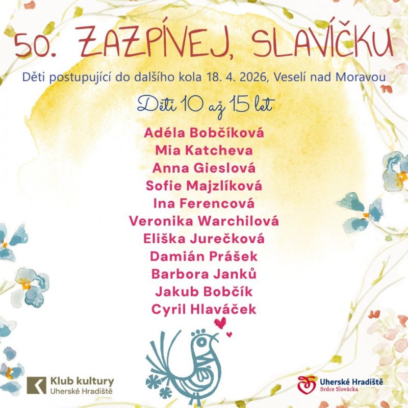 Ti budou reprezentovat svůj region ve slováckém finále 18. dubna 2026 ve Veselí nad Moravou. Všem postupujícím srdečně gratulujeme a držíme palce v dalším kole!