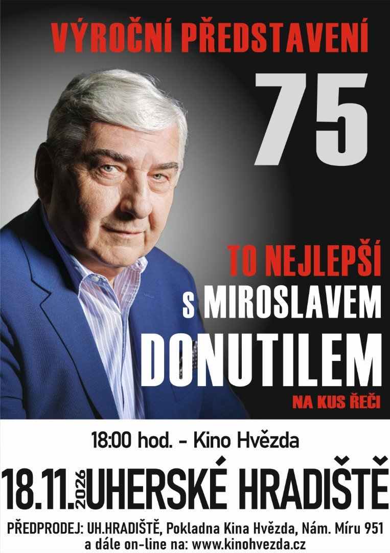 Legendární český herec, bavič a vypravěč MIROSLAV DONUTIL slaví neuvěřitelných 75 let a své životní jubileum se rozhodl oslavit tam, kde to má nejraději: na jevišti, mezi svými diváky.V listopadu tak zavítá do Uherského Hradiště s oblíbenou one man show Na kus řeči, která už roky baví publikum po celé republice.