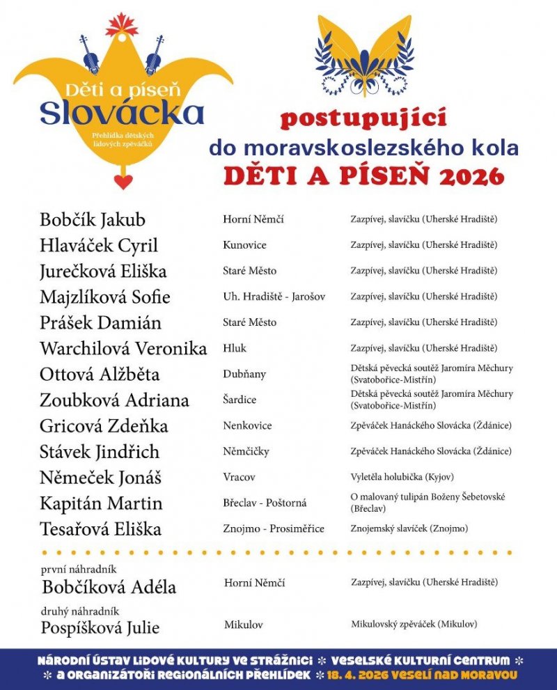 V sobotu 18. dubna 2026 hostilo Veselí nad Moravou oblastní finále soutěže Děti a píseň Slovácka. V silné konkurenci 38 nejlepších zpěváků z celého regionu – od Podluží až po Horňácko – se naši zástupci neztratili. Právě naopak!