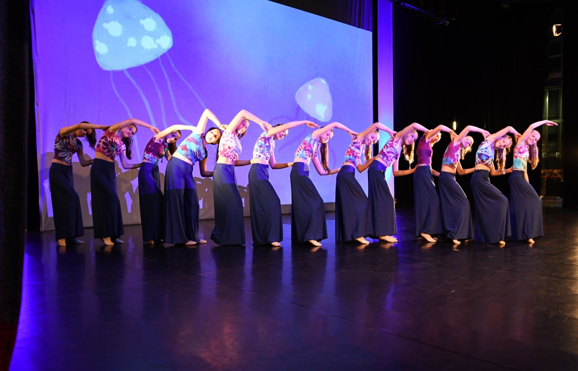Projekce k jednotlivým choreografiím je vytvořena z obrázků žáků Výtvarného oboru ze třídy Lenky Šáchové Ulipové.